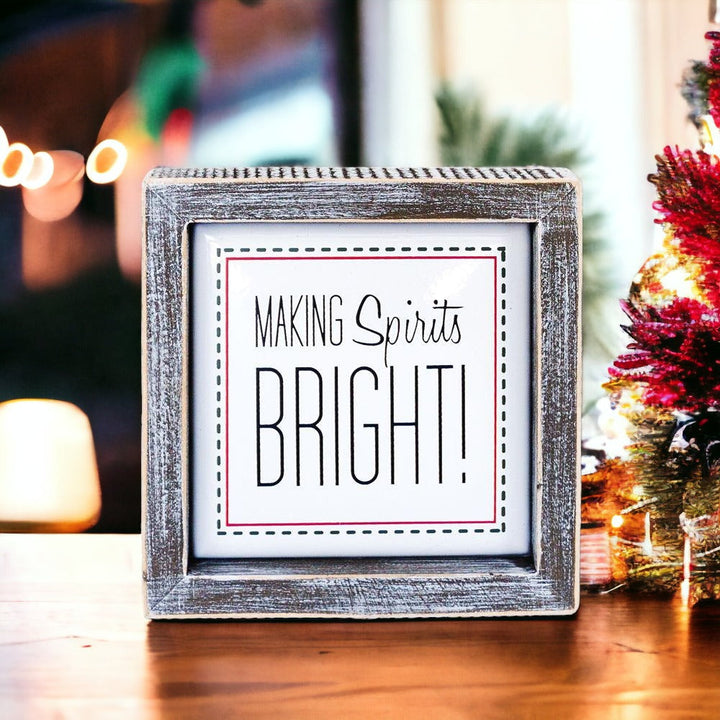 This wooden framed and Metal Embossed Sign Reads: Making Spirits Bright, with accent red border colors.