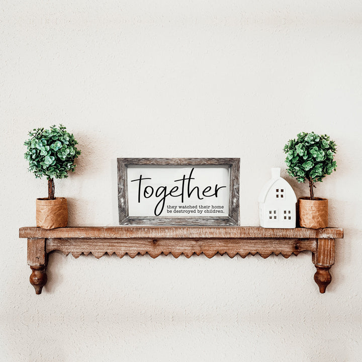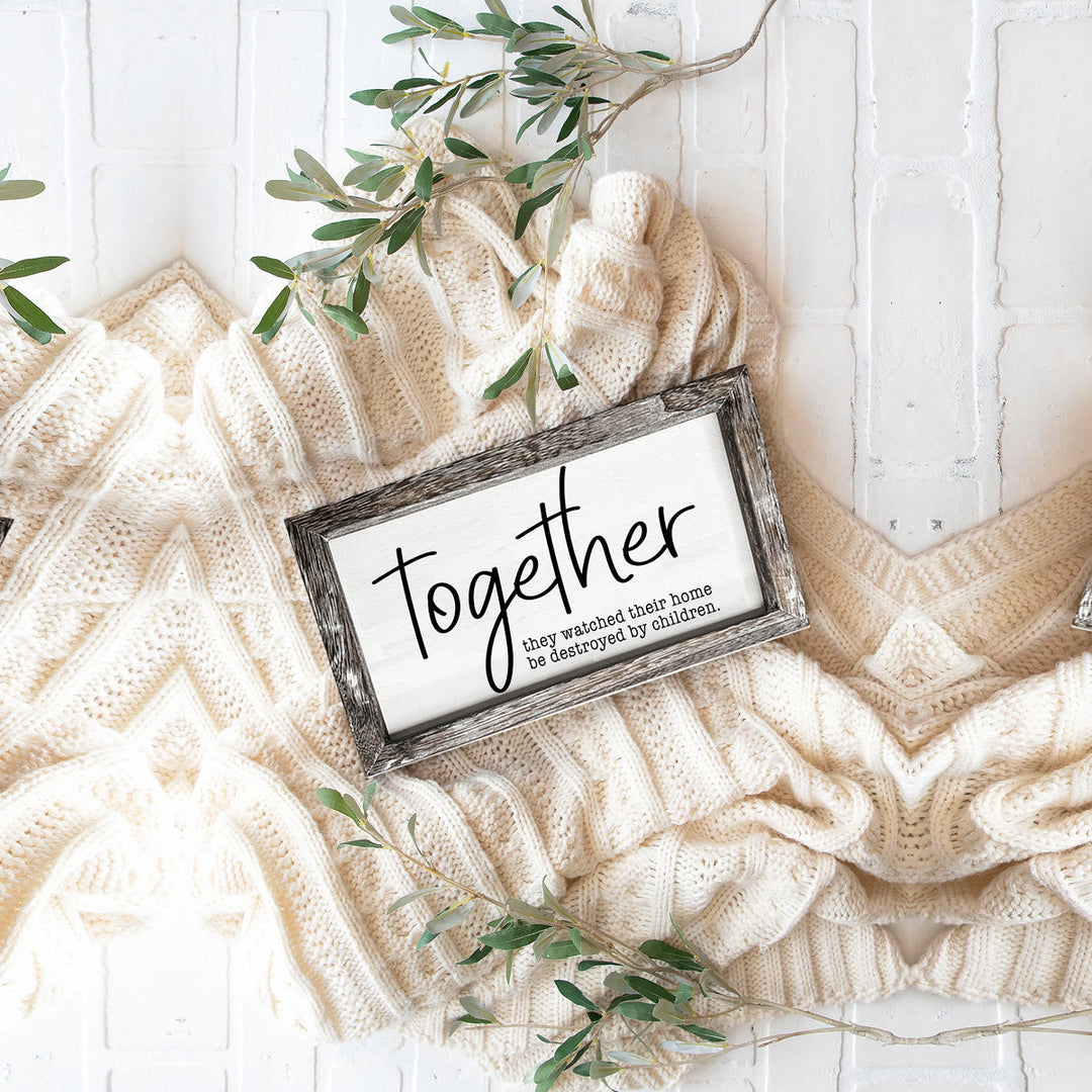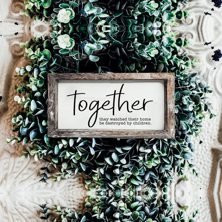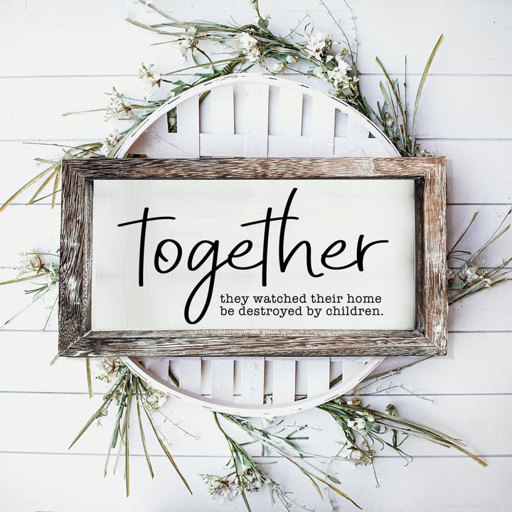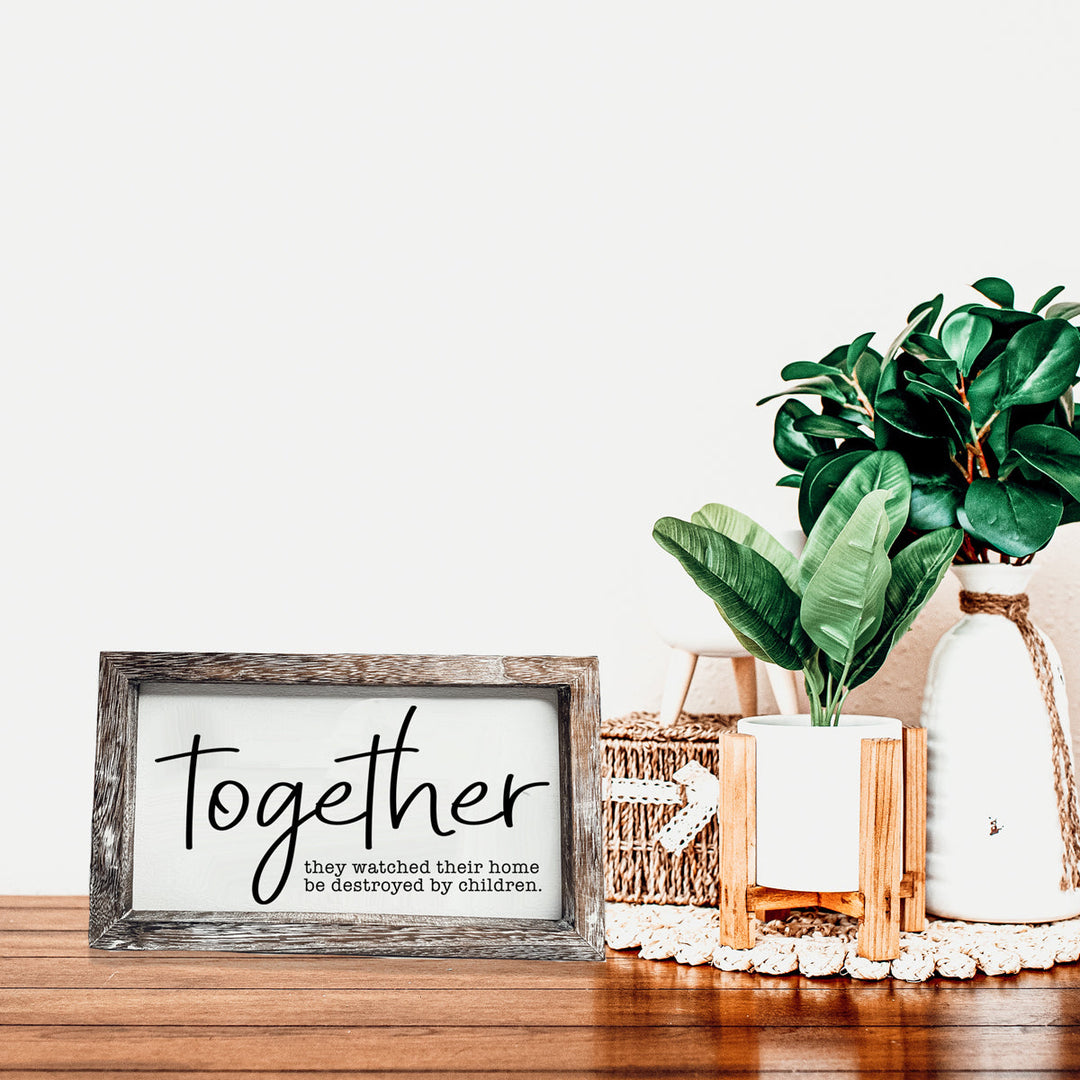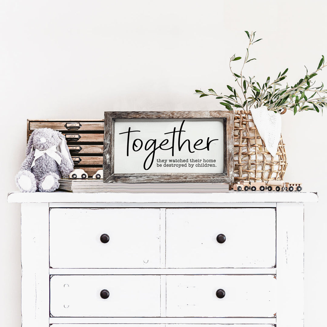 Our Together Sign is ideal for parents looking for a funny quote to decorate their home. Its wooden construction adds a classic feel and its witty message speaks to the joys of parenting (and not such joyous moments). Plus, it's sure to bring a smile to your face each time you see it, creating a lasting and special bond with your family. Along with anyone who enters and reads it. Doubles as the perfect gift for another parent, who will treasure it on their walls for years to come, made to blend into any decor style.